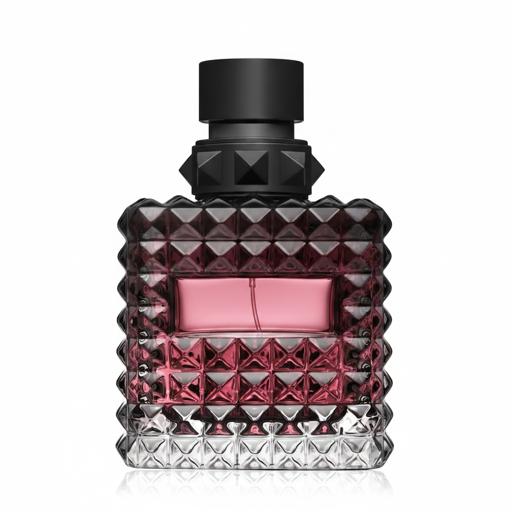 This rich, captivating fragrance is housed in a weighty, statement-making bottle defined by its edgy pyramid studding and luxurious deep magenta liquid. The matte black cap completes the look of fierce, modern sophistication. It announces itself with a powerful and irresistible opening of dark, boozy black cherry and a vibrant spike of pink pepper, creating an immediate sense of luxurious intensity.